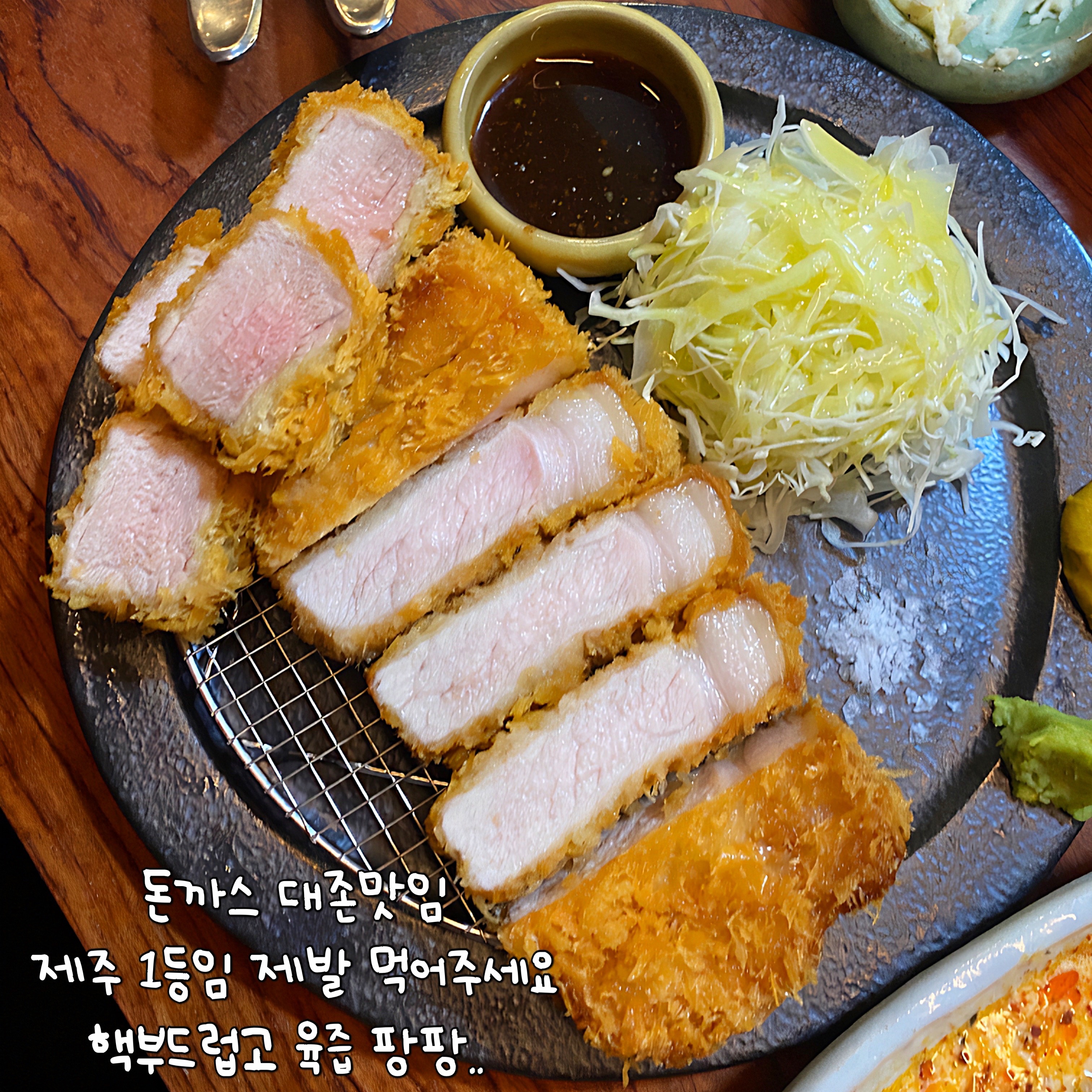 이 집 돈까스 진짜 맛있다.. 사실 이때 진짜 맛있다고 생각했는데 이 이후에 더 맛있는 집을 찾았다 ㅎㅎ ㅋㅋ 사진 편집 한지 벌써 두어달이 흘렀기때문에 다른집 얘기는 일단 넣어두고, 이 때는 진짜 맛있게 먹었다 특히 저 비계부분이 미쳤다. 도민인 내 지인은 진짜 제주에서 젤 맛있다고 했고 나도 진짜 맛있게 먹엇다 ㅎㅎ 기름지고 촉촉하고 돼지고기가 부드럽고 다한다.