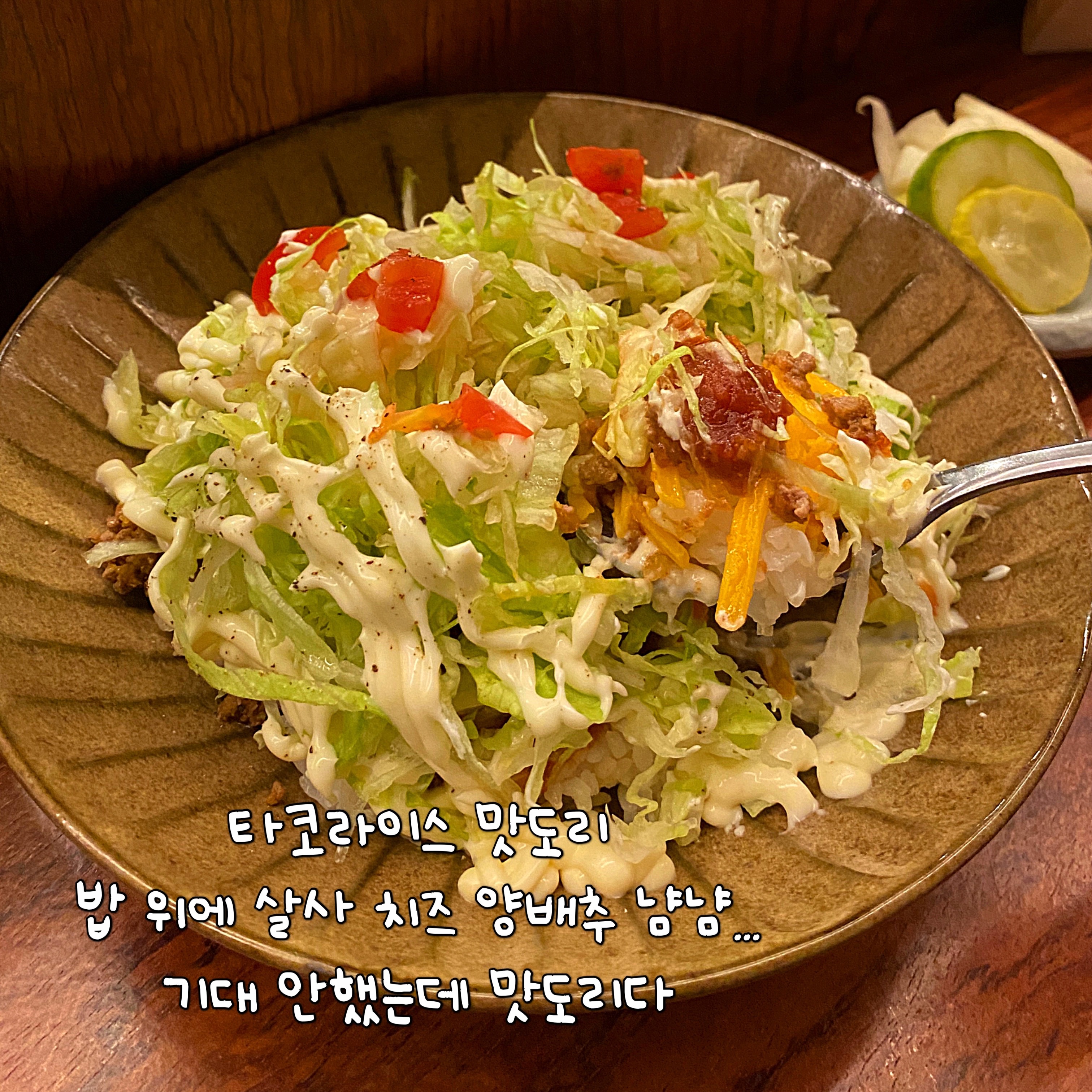 역시, 유명하지 않은걸 도전 할 땐 하이리스크지만 그게 성공 했을때 나오는 카타르시스, 이 집에서 이게 젤 맛있었다. 딱 전형적인 미국식 멕시칸 음식, 즉 패스트푸드 느낌을 정말 잘 살렸다. 밥 위에 양상추 (왜 양배추라고 적은것임?), 슈레드 체다, 살사 등 뭐 그냥 미국의 맛 좋아요 ~ 좀 아쉽다면 밥이 너무 코리안? 근데 이건 어쩔 수 없는게 밥 하나로 돈까스류 사이드도 나가니 만조쿠 하면서 먹었다